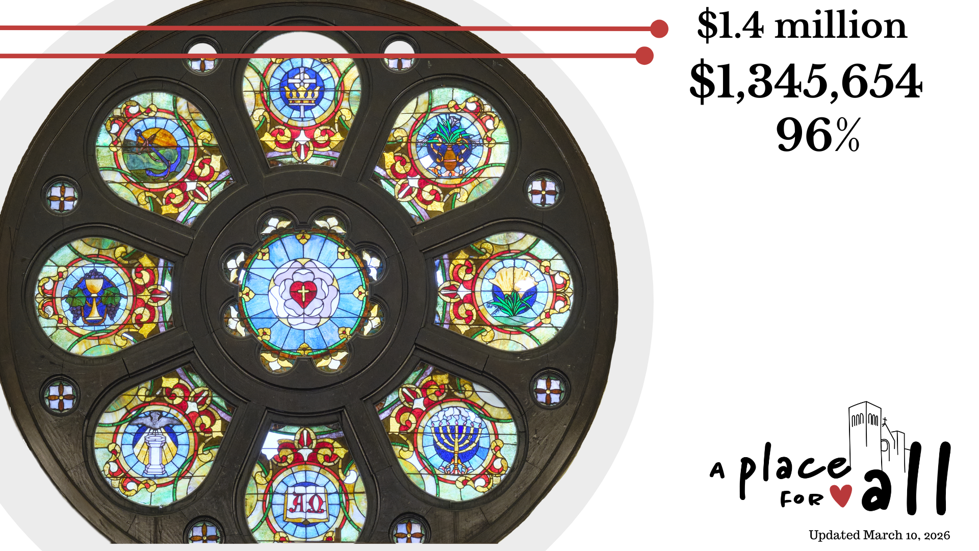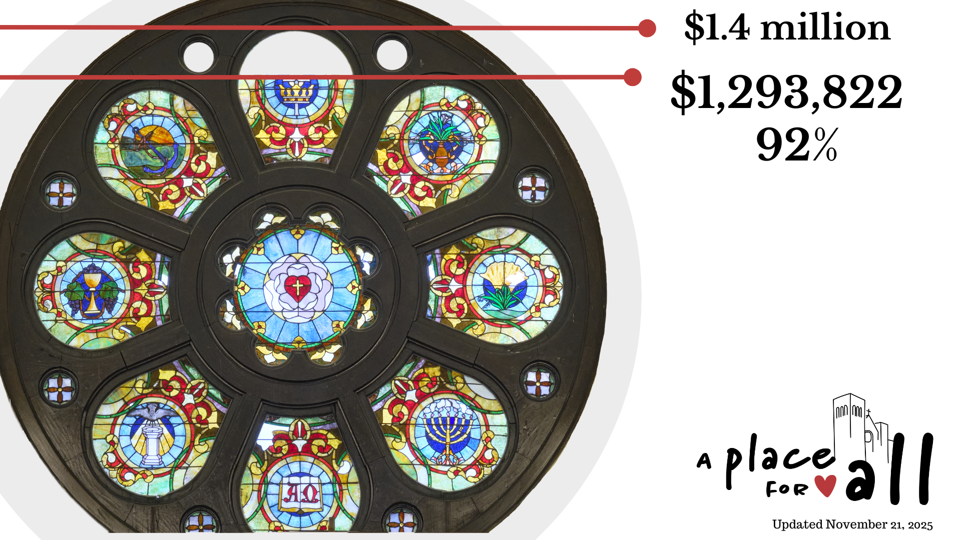 A: The campaign goal for phase 2 is between $1.5 million and $2.2 million. This project is three-pronged: (1) welcome diversity with an elevator and ADA-accessible, gender-neutral bathrooms, (2) preserve and restore our historic architecture including our Rose Window, and (3) enhance community spaces.