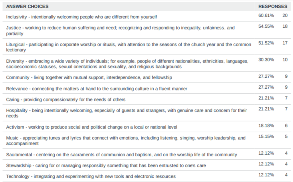 In early 2021, the Congregation Council engaged in a time of listening to hear what kind of things we learned about our faith community during our time of exclusively Digital Church along with discerning our congregation’s values. We offered 8 groups along with an electronic survey during “A Time to Listen.” Over 35 people participated in our discernment. Below are a few highlights.