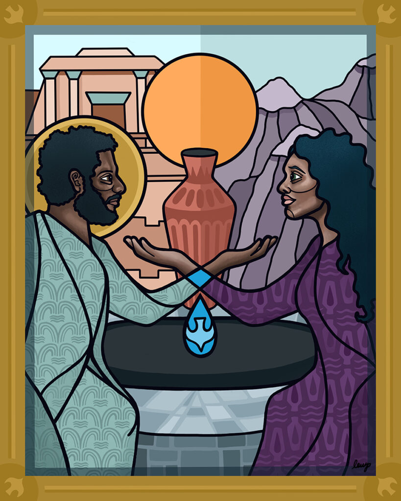 - In the heat of midday, Jesus seeks out a Samaritan woman drawing water from a well. His command to her is also a question and an invitation into a new way of life: “Will you give me a drink?” This question creates a dialogue between them in which Jesus sees the woman fully; she leaves the well transformed. In the wilderness, the Israelites essentially ask: “Will you give us a drink, God? Will you take care of us, even now?” This week, we might imagine ourselves at the well or in the wilderness. Are we willing to care for our neighbors, seeking to not just quench thirst, but to find living waters that sustain us all?